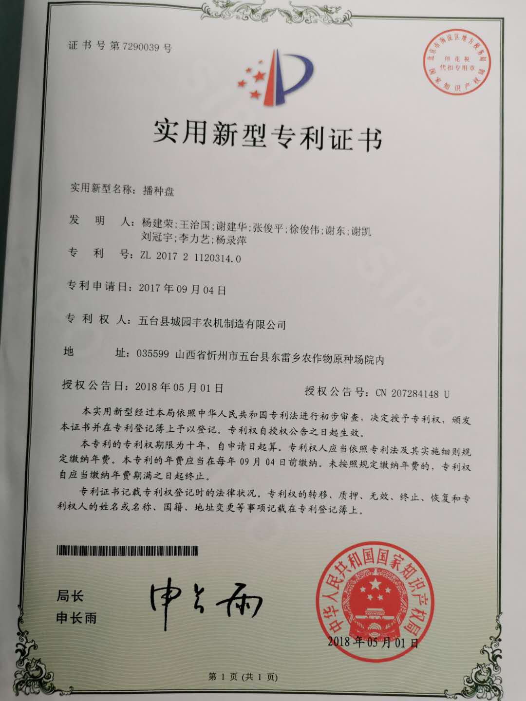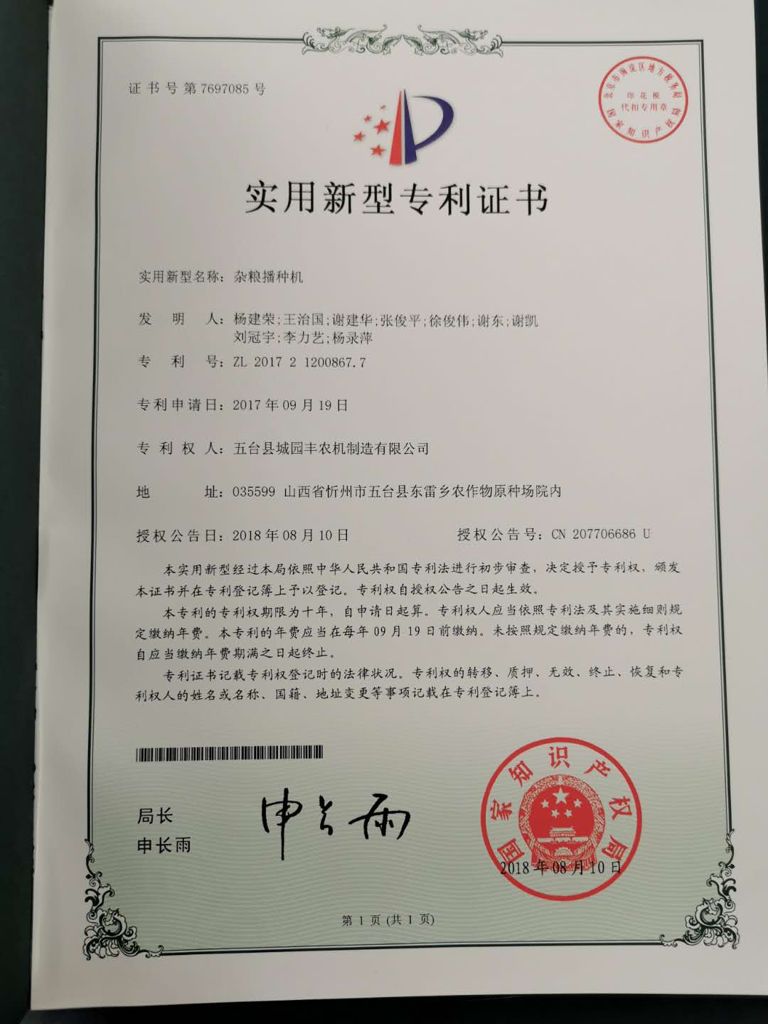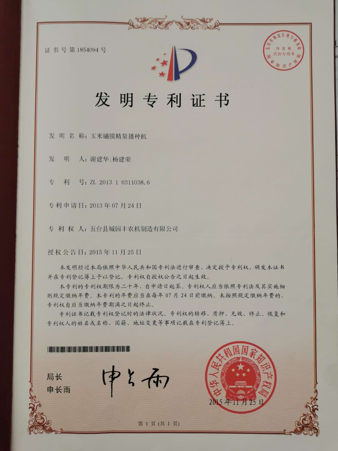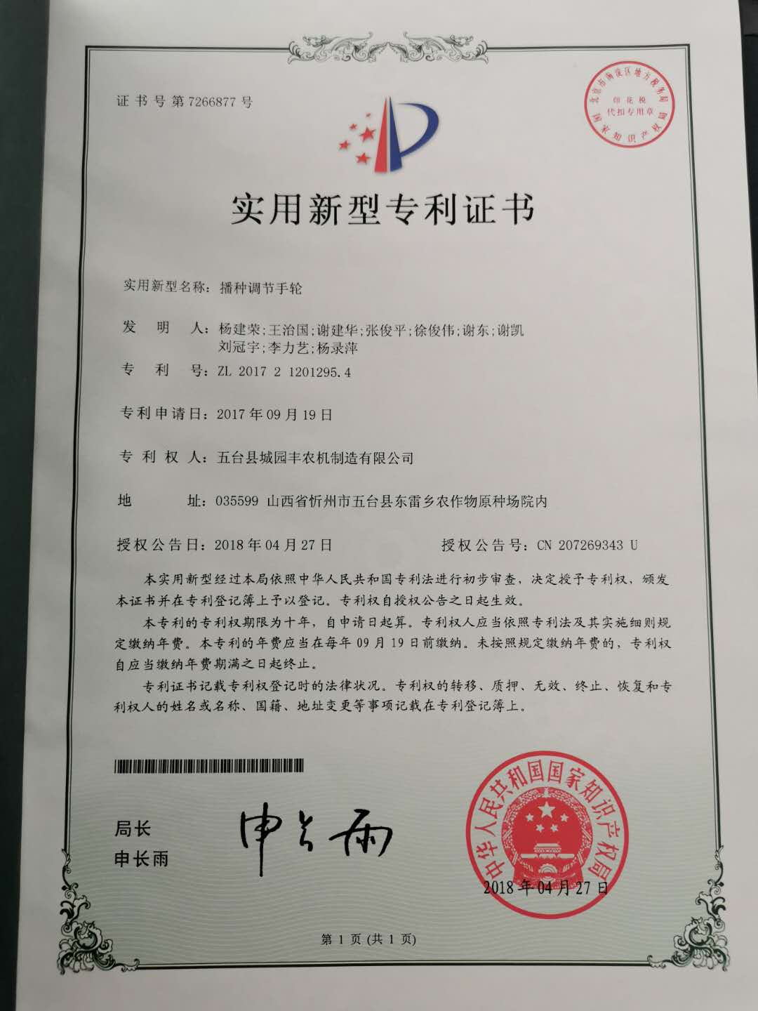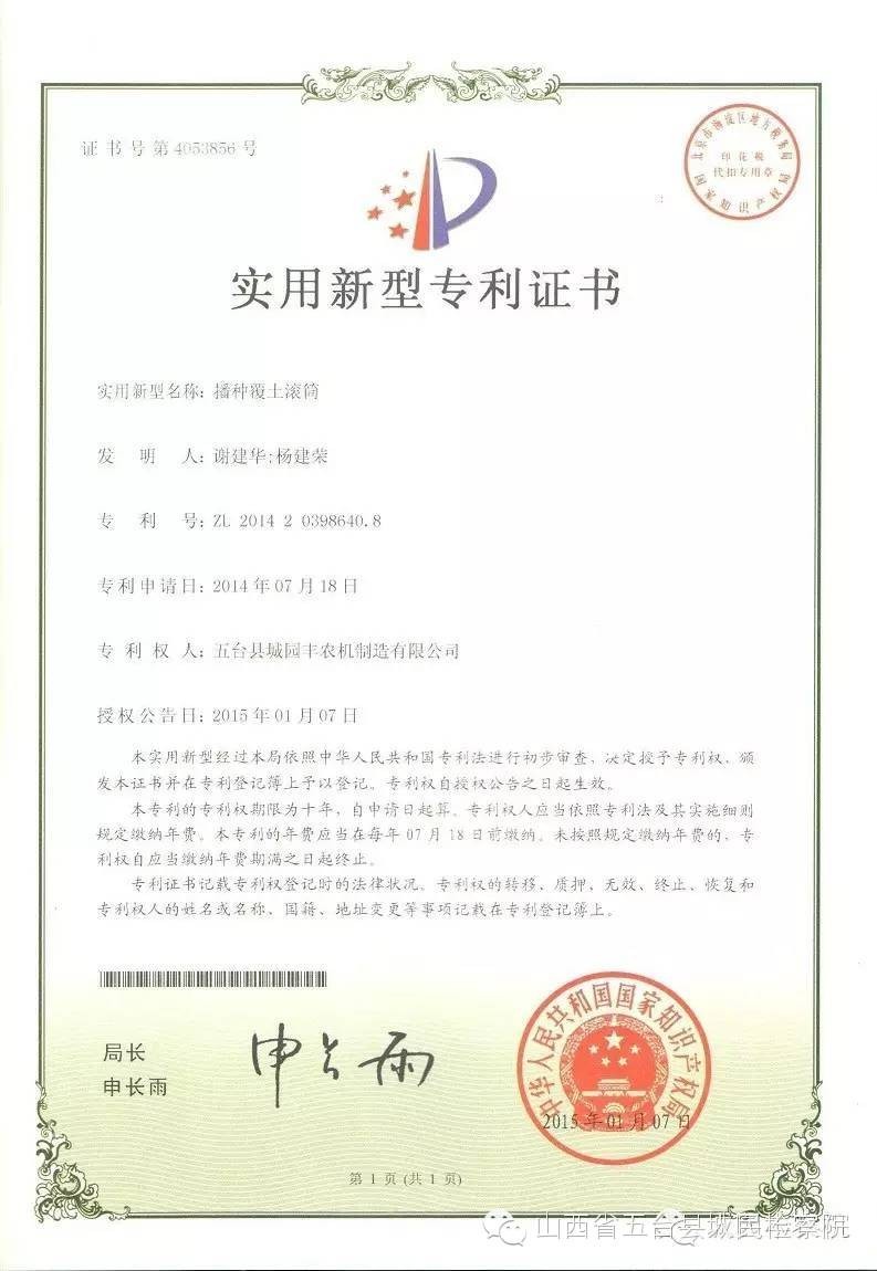 公司的主要產(chǎn)品玉米鋪膜精量播種機(jī)的研發(fā)制造推廣獲得了2013年忻州市科學(xué)技術(shù)進(jìn)步獎(jiǎng)、一項(xiàng)發(fā)明專(zhuān)利及5項(xiàng)實(shí)用新型專(zhuān)利等。